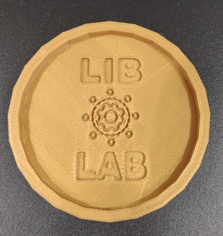 This medallion has the LibLab logo in the center with Lib above it and Lab below it. In the file uploaded, there is a hole above the "I" so that you may put it on a necklace or hang it from the ceiling, though this hole is not present in the photo.